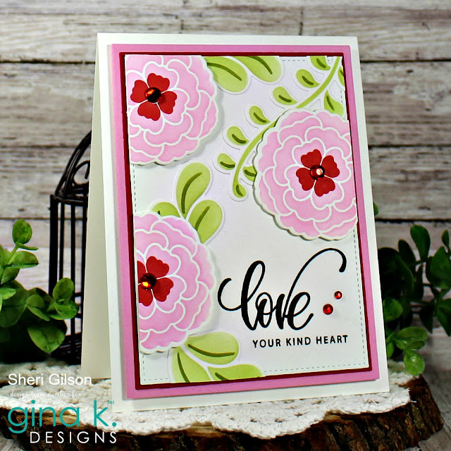 Here's a card I created with the NEW A Little Love Layering Stencil Bundle and blending brushes. I used the dies that come in the kit to add dimension to my card instead of using the stencil directly on the card front. The flowers are popped up with foam squares for even more dimension. I did stamp the sentiment directly onto the card front. For embellishment I added a few rhinestones from my stash.