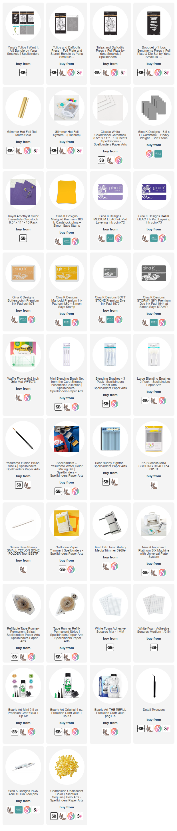 My card features Spellbinders NEW Tulips & Daffodils Press + Foil Plate and Stencil Bundle (BD-1072) and a sentiment from the Bouquet of Hugs Sentiments Press + Foil Plate & Die (BP-354). These are all from the NEW Yana's Tulip Collection by Yana Smakula. I foiled the images with Matte Gold Foil (GLF-002).
